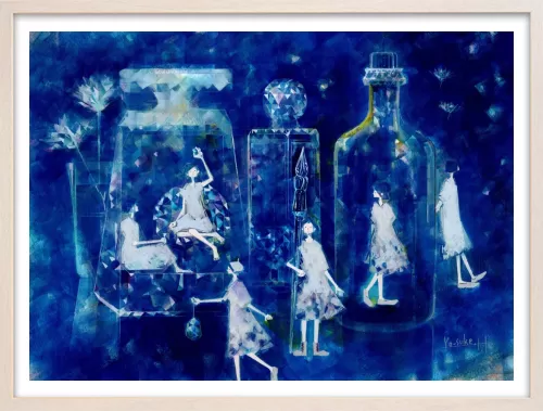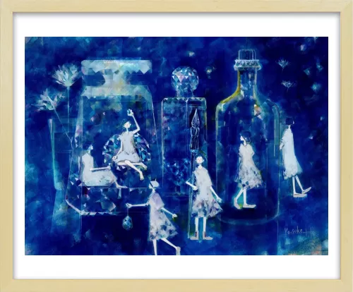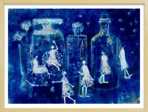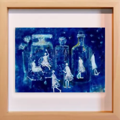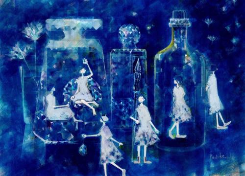ガラス瓶をモチーフにした物語の世界観を表した作品です。多面体にカットされていたり湾曲したガラス瓶は光を曲げたり反射したり遮ったりして静かな空間に不思議なマチエールを与えます。複雑な光のコントラストに見え隠れする物語を描いてみました。