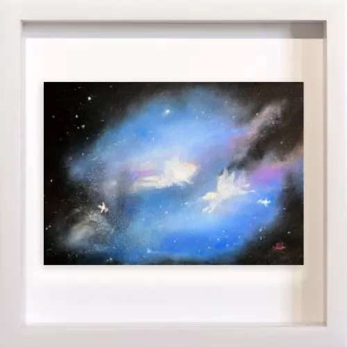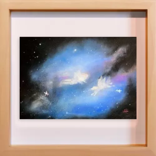 ボックス額の空間にセッティングされた作品は、立体的な余白や光による陰影とともに、作品を特別なものにしてくれます。