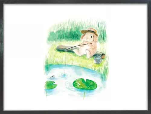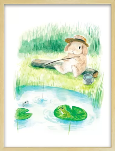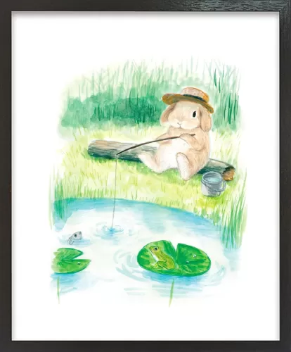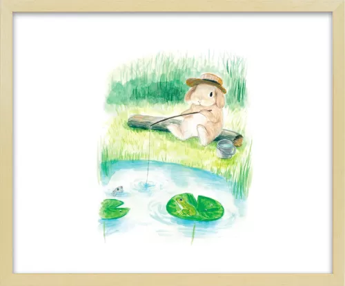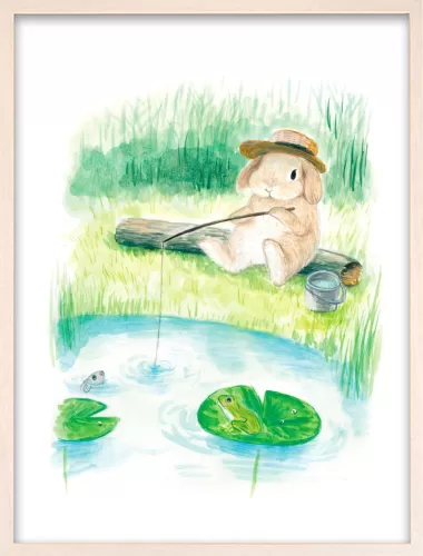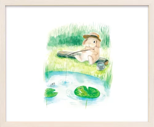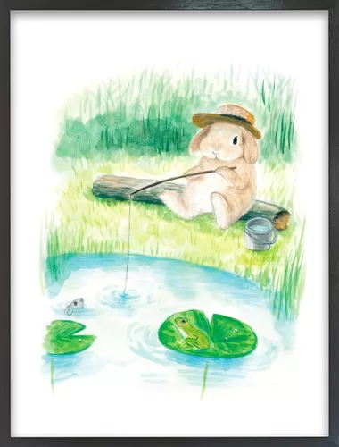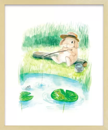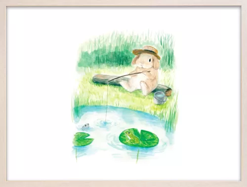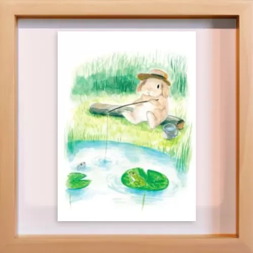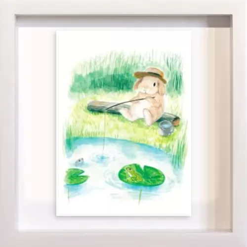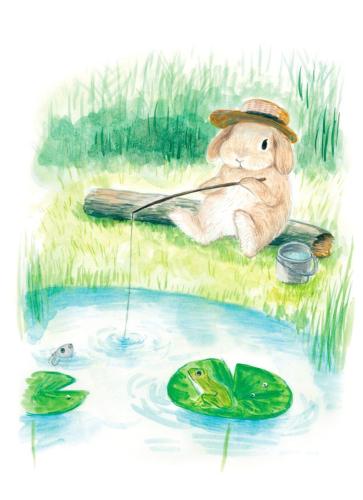 This artwork depicts a lop-eared rabbit enjoying fishing alone by a peaceful pond.