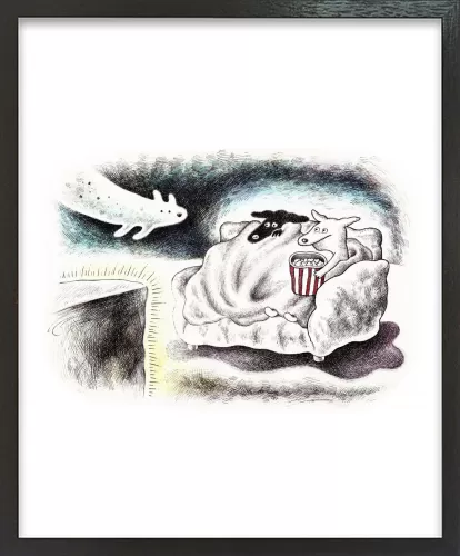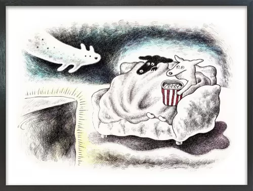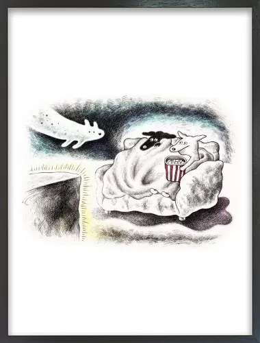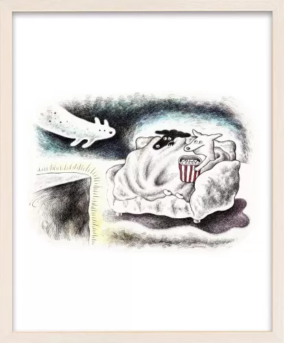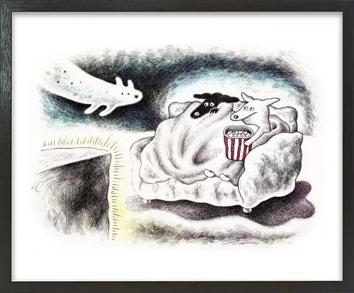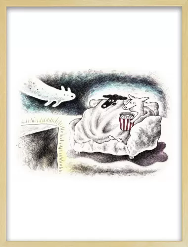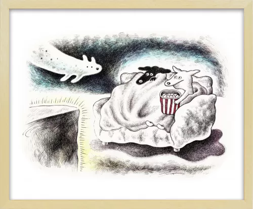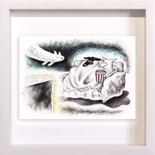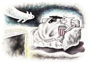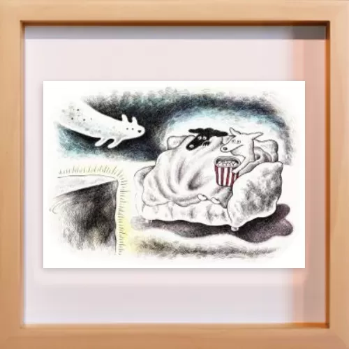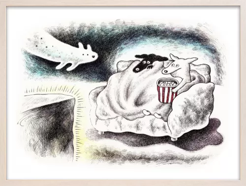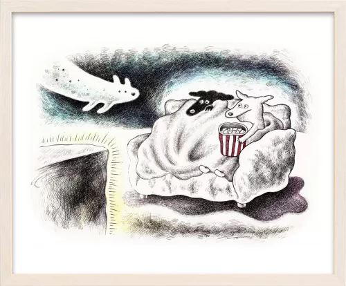 ホラー映画を見るときの心細い気持ちと、ブランケットに包まる安心感、だれかと一緒に見るワクワク感を描きました。こわくて可愛いオバケ犬も登場させました。