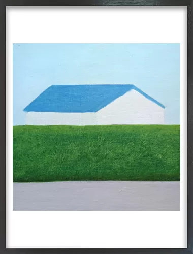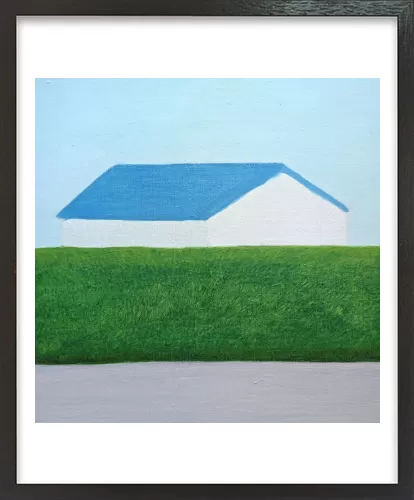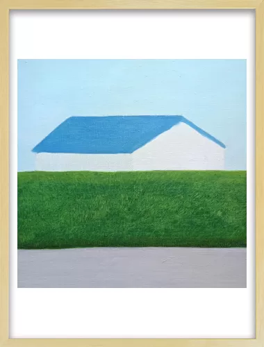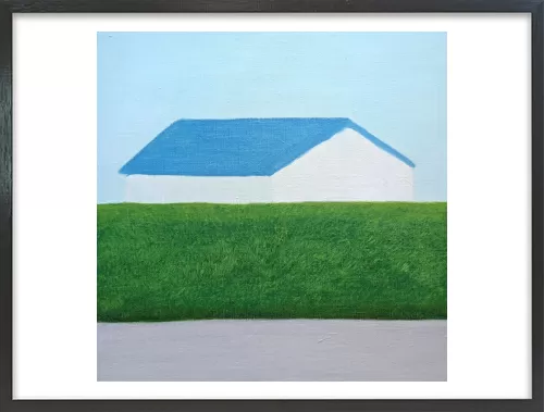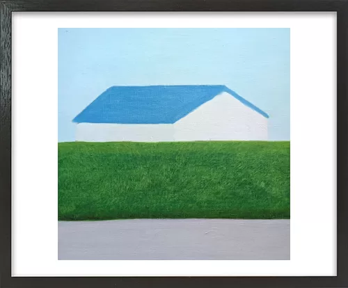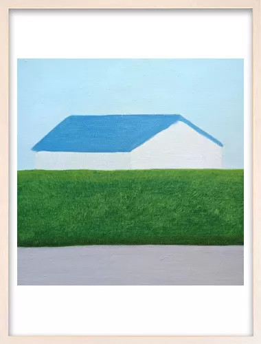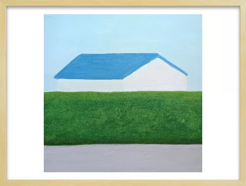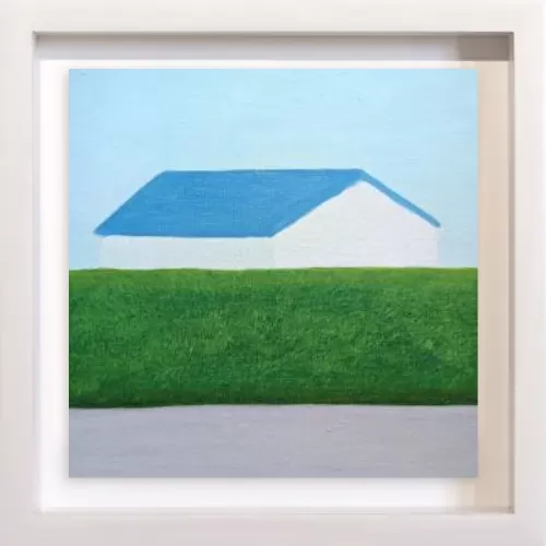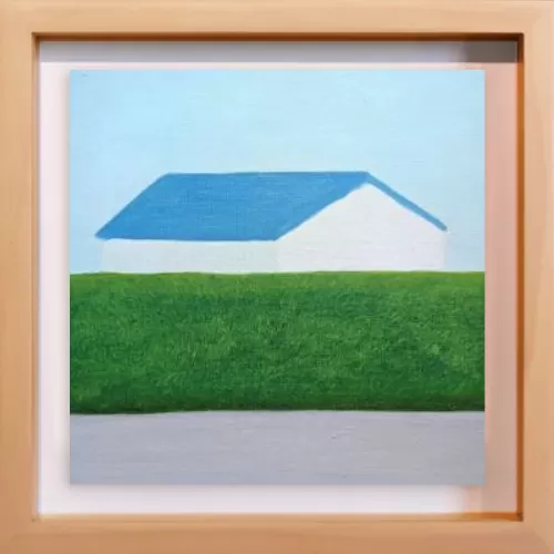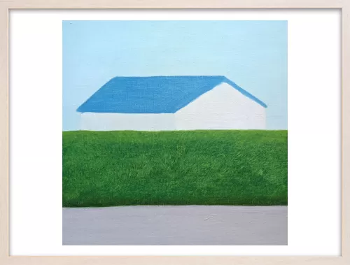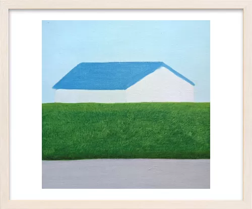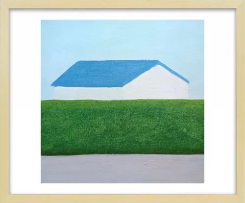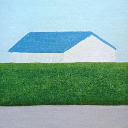 水平に重なる地面と生垣とその向こうにある家。その形と距離感に心を奪われ描いた一枚です。